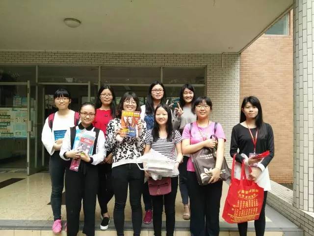 收集捐赠书籍的志愿者们在宿舍门前拍照留念