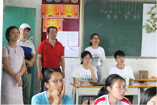随后,杨敏生一行在队员们的陪同下参观了课堂。齐湘燕表扬了队员们的教姿教态。同时,老师们对大湾服务队开展课程的丰富度给予了高度评价。参观完教室后,老师们就具体问题和队员们探讨,鼓励队员们将在课堂上所学的理论应用到实际中。熊涛建议,队员们可以利用空闲时间走访学生家庭,深入了解学生,以此实现老师与学生双向学习的目的。