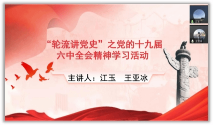 12月6下午第四教学部党支部举行线上活动,学习党的十九届六中全会精神,深入推进大学英语课程“三进”专题研讨。会议由支部书记曾丹老师主持,全体教师党员参加。