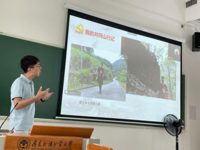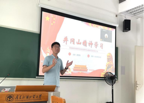 吴世傲首先介绍了井冈山革命斗争时期的历史背景,让同学们了解到井冈山革命根据地在艰难困苦中的创立历程。分享了4月在江西省井冈山培训学习时的所见所闻,分别介绍了井冈山革命烈士陵园、大井毛泽东故居、小井红军医院、八角楼、朱毛挑粮小道等革命遗址,以图片和视频的方式,向同学们生动展现了当年发生在井冈山感人至深、可歌可泣的英雄故事。同学们纷纷为革命先辈勇于奉献、敢于牺牲的精神所打动,更加坚定了中国共产党人的理想信念。