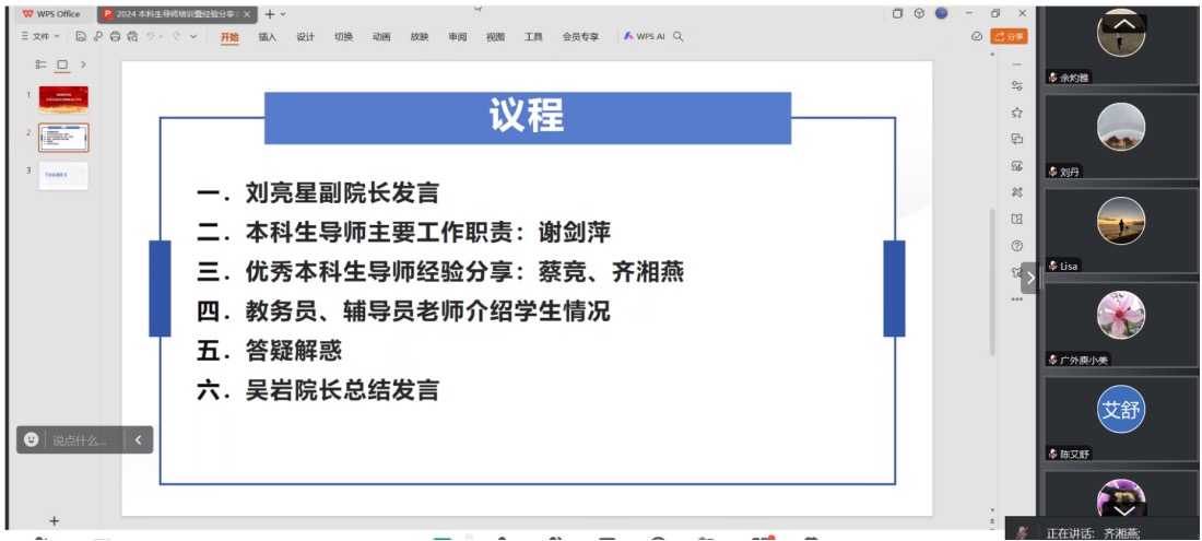 2023年度优秀本科生导师蔡竞老师分享了担任本科生导师以来的心路历程,介绍自己如何从课程建设、心理建设等方面为本科生提供全方位的指导;齐湘燕老师从与大一学生的互动、对学生的学习和生活关怀等层面展示了自己如何成为学生们的良师益友。两位优秀本科生导师代表将对学生的关心、关怀切实融入日常教学及与学生的互动之中,从思想、方法、行动等层面为新任本科生导师提供了丰富的经验借鉴。随后,学院教务员周梦鸽老师,辅导员迟殿凤、李敏嘉、周靖凯老师也分别从各自分管工作的角度介绍了学院不同年级学生的情况,并对学生日常管理工作中的常见问题与解决方法进行了分享。