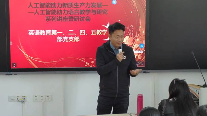 3月20日中午,在校园里木棉花和紫金花的见证下,北校第一教学楼南105报告厅座无虚席,伟德国际1946“党建引领人工智能赋能教育创新——智能技术助推新时代语言教学与研究高质量发展系列讲座暨研讨会”(第三场)在此隆重举行。研讨会由第四教学部党支部书记周金华主持,来自四个教学部党支部的党员教师及骨干教师齐聚一堂,共同见证人工智能技术与语言教学研究的深度融合。