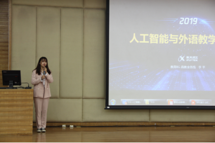北京科大讯飞教育BG高教业务线李平介绍了人工智能与外语教学的融合,包括人工智能技术在日常生活和教学中的运用,并详细介绍了AI智慧外语教学平台。