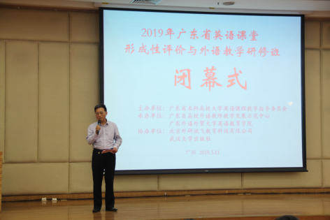 董金伟在闭幕式致辞中,简要回顾了研修班一天的学习内容:刘建达教授的主题报告具有学术性、思想性、引领性和指导性;我校大学英语教改团队和广技师、广东医大的团队展示具有借鉴性和参考性;科大讯飞的分享具有操作性。他认为今天研修班的课程内容充实丰富、形式紧凑、效果非常明显;提到了大学英语的改革方向明确,方法清晰;强调了形成性评价教学理念和课程体系建设的重要性,并对到场的我校及各高校的专家学者和会务组织团队表示感谢。