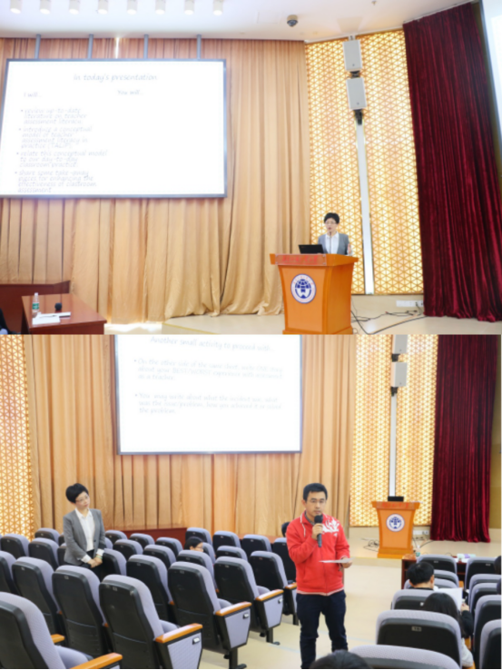教育学院教师、广东省“青年珠江学者”许悦婷教授在会上就教师专业发展作了题为“Understanding English language teacher assessment literacy in practice: Complexities of issues and implications for practice”的主旨发言。她首先让在座教师们回忆自己经历过的“最棒的和最不理想的评估经历”,引发大家的思考。然后简单回顾了近几十年关于教师评估素养的文献,接着介绍了自己和Brown教授合作构建的一个教师评估素养模型。一针见血地指出目前教师评估素养不足的问题,评估课程、实习实践中的评估培养不到位等问题,引得大家的赞同。最后,教师们积极发言交流,从自己课堂评估中发现问题。张骏宇老师有感而发,从自己学生的反馈中谈到自己的反省,真切而具有启发意义,现场掌声阵阵。