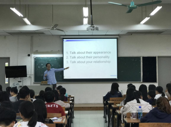 公开课的内容源自课本《新大学英语1》第二单元的人物描写,描写是大一学年第一学期的写作练习重点,因此吕老师的公开课就以此为教学目标开展教学活动。课堂教学分为四个环节,环环相扣,将学习内容步步推进,难度深度层层加大。小组管理和竞争的理念深入人心,力争上游的学生不甘示弱并全力以赴参加各项教学活动。第一个教学活动动静结合,学生边走边思考着英语句子的组合和归类。第二个活动有张有弛,在视频听力中寻找人物描写的相关信息点,视频材料长短适宜。第三个活动,用形象直观的图片讲解各类外貌特征,分类清晰,词汇丰富,学生有恍然大悟的感觉。配有相关练习描写图片人物的外貌,实时检测学生的学习效果。第四个活动难度上升,播放的视频听力语速加快且词汇都加多,但是视频内容新颖,贴近生活,学生兴趣盎然地听写着英语脚本。在这节课中,学生练习了口语听力,增长了词汇和表达。不知不觉,在这活力课堂中,学习的效果就发生着。