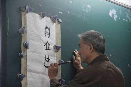 (图为陈金诗为同学们展示斜体行书)