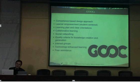 教育部高等学校大外教指委委员、广东省本科大学英语课程教指委主任、伟德国际1946,Bevictor伟德副校长刘建达为此次研修班作了第一场精彩主题报告。刘建达围绕“现代技术背景下的大学英语教学改革”这一主题,首先对在线开放课程( Massive Open Online Course MOOC),即慕课的两种基本形式cMOOC和xMOOC做了对比分析:前者强调自学互助模式、侧重知识建构与创造、强调创造、自治和社会网络学习;后者接近于传统教师授课的在线教学模式,侧重知识传播和复制、强调视频、作业和测试等学习方式。刘建达接着结合《大学英语教学指南》要求,从宏观到微观层面阐述了慕课教学给大学英语教学改革带来的前景。刘建达轻松、幽默的报告让教师们对MOOC有了更清晰的理论认识,他提出的“GOOC”概念也获得与会人员的高度认可。