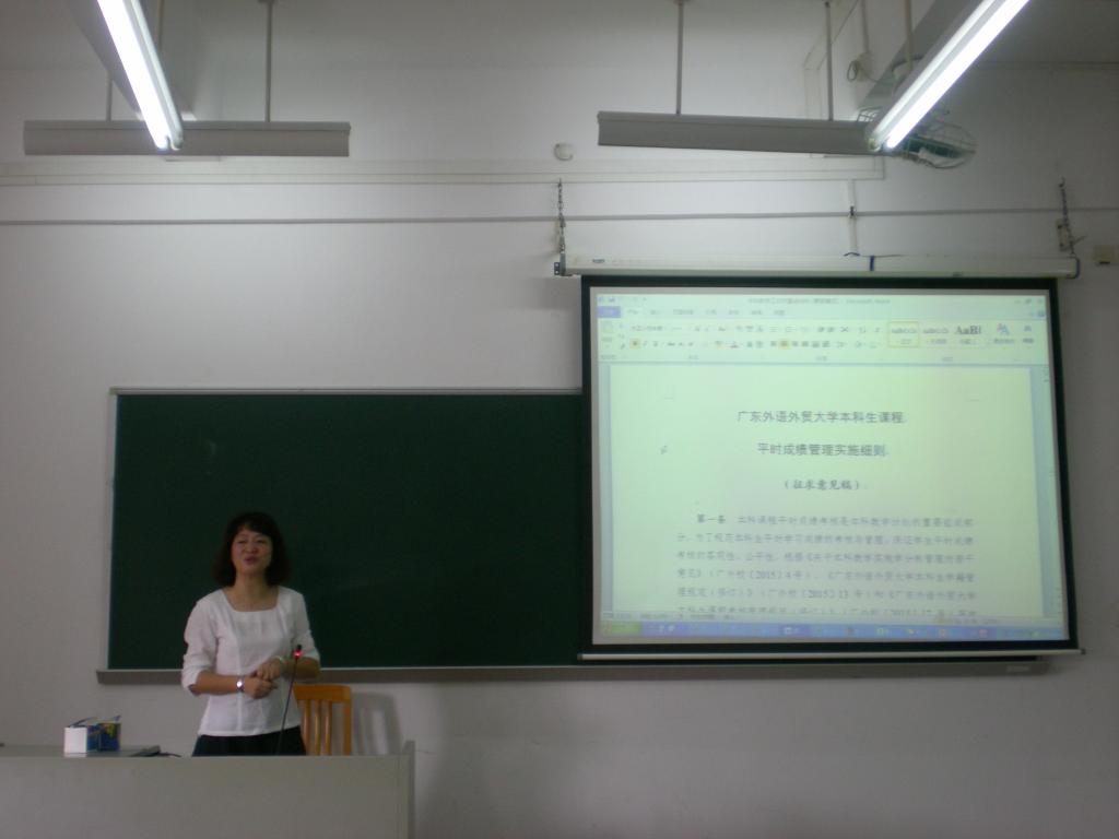 本次研讨内容充实丰富,议程主要由三部分组成:教学改革经验交流、出国访学经验分享及新学期工作布置。吴岩副院长首先做了讲话,她传达了大学2015年下半年本科教学重点工作,并重点强调了在教学管理中的新规定,如本科生课程平时成绩管理实施细则、本科生慕课(MOOC)学分管理办法及本科教学全英/双语课程管理规定等。