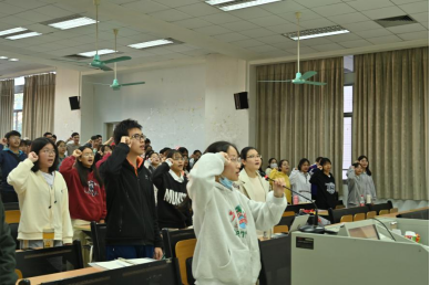 在21级级长徐梦萍带领下21级全体学生进行考前宣誓。宣誓之后,19级苏文与李沂姗给同学们分享了学习以及竞赛方面的经验。苏文从日常英语学习和期末备考两个方面给同学们分享她的学习经验。在日常英语学习方面,她认为要细心观察生活,在生活中学习与运用英语,利用碎化时间来学习英语,用英语去思考。在期末备考方面,她认为我们应该给自己制定合理的计划,准备好适合自己的资料,复习时区分重难点,保持良好心态。