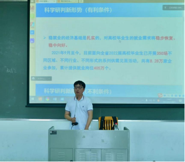 刘博洋讲解了2022届毕业生的就业形势。他从经济、政策和企业招聘等方面分析了就业的有利条件,并从就业规模、就业环境、就业结构和就业观念四个方面科学分析了就业的不利条件。他强调,疫情是一个很大的影响因素,同学们在做选择时要慎重考虑。他系统分析了升学深造和考公考编的形势,并指出这三者虽然竞争压力大但待遇良好,因此仍令许多毕业生向往。为了让同学们能够及时获取更多相关信息,刘博洋提醒同学们可以通过“广外就业”微信公众号获取本校毕业生就业情况以及通过登录学校招聘网站获取相应招聘信息。他鼓励同学们积极参加线下招聘会,了解企业人才需求情况并培养相关技能。