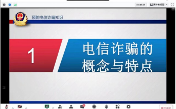江楚銮以番禺区近期几则警情通报为引入,阐释了电信诈骗的概念与四个特点。她分析数据得出青年群体上当受骗比例高,指出青年群体应提高自我防范意识,避免遭遇到电信诈骗。在各种诈骗类型中,刷单兼职案件的比例最高,她强调同学们应特别警惕此类诈骗手段。她还播放反诈版歌曲《成都》,进一步提高同学们对电信诈骗的认识。