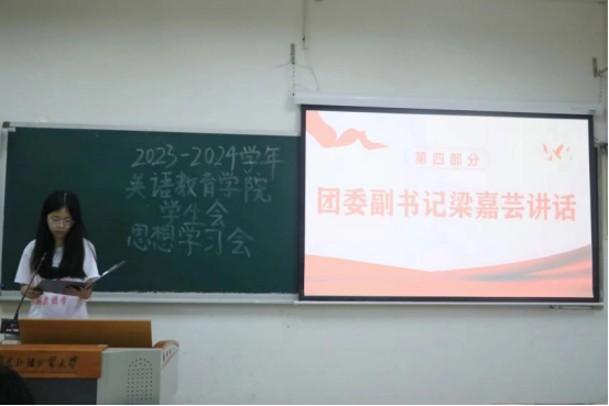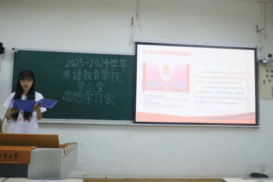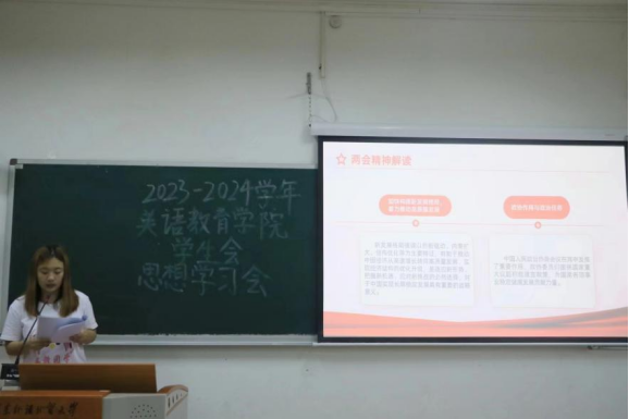晚上八点整,主持人何川熙介绍本次思想学习会的各项议程,并宣布2023-2024学年伟德国际1946学生会思想学习会正式开始。她向各位工作人员介绍了2024年全国两会及其概况并通过两个视频生动形象地带领各位工作人员学习了2024两会工作报告以及两会涉及的关键词。