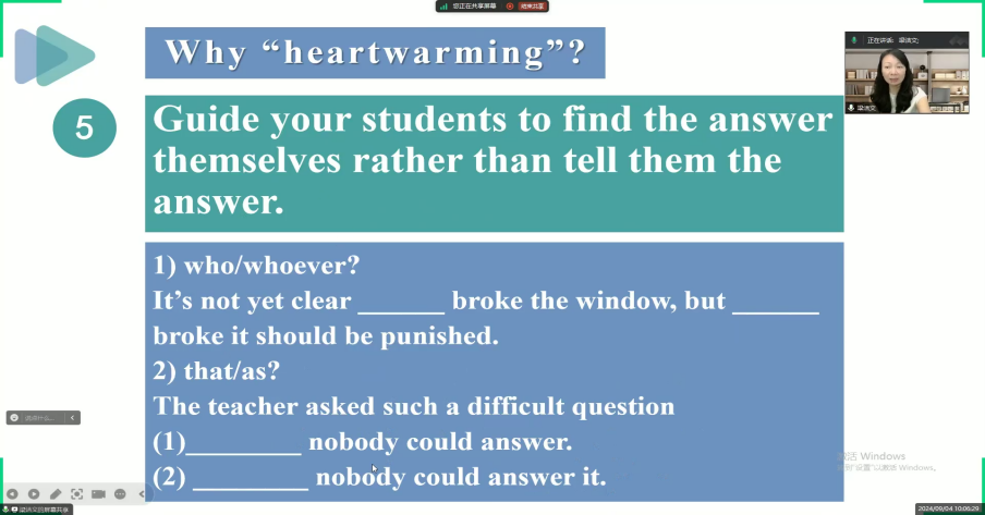 在整个经验分享过程中,梁洁文老师贯彻落实“心中有学生”的教育理念,通过提问的方式与线上的准实习生们保持互动,极大地拓宽了学生的思维和视野。在讲座问答环节,学院的同学们积极发言,结合自己的实际经历与讲座内容向梁洁文老师提出了疑问。梁老师凭借丰富的教学经验,给出了极具价值和实用性的建议,让同学们受益匪浅。