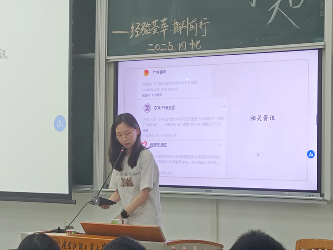 在分享环节,师姐和师兄们从竞赛、保研与社会实践不同维度分享自身经验。吕嘉慧从研支教团这一路径分享自己的保研经验。她从服务年限、选拔标准等方面介绍了“研支教团”这一项目,向英教学子分享了如何获得相关资讯,提前准备,在这一项目选拔中取得优势,脱颖而出。最后,吕嘉慧通过梳理大学四年的成长轨迹,向在座学子阐释:人生没有白走的路,每一步都算数。