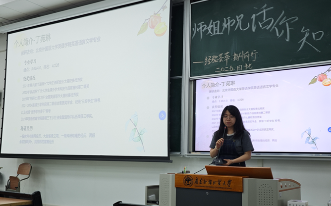 成功上岸北京外国语大学英语语言文学专业的丁苑琳为同学们分享保研的经验。向同学们介绍了保研的步骤、时间线与考核方式,并通过自身经历分享了现阶段可做的准备——思考读研方向并利用学院资源提升个人背景。最后,丁苑琳寄语英教学子,保研需坚持一个原则:敢于投递自己的梦校,并相信自己是有值得被院校选择的闪光点的!