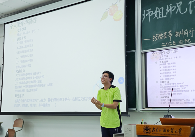 最后,宗沛霖分享自己的保研和实践经历坦言,自己的保研是一个0竞赛、0科研的特殊案例,他的分享涵盖学习方法、社会实践、实习经验、专业备考与保研等多个方面。此外,宗沛霖格外强调“积累”二字,在此次分享中,他始终鼓励同学们勇于尝试,抓住机会,丰富自我。他希望同学们在今后的大学生活里可以享受过程,尽情拥抱大学生活,学有所获,学有所成。