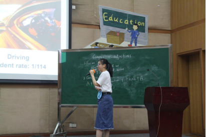 经过短暂休息,下半场的比赛开始。同样是讲解形容词比较级,五号选手洪惠琪选择用卡通樱桃小丸子吸引学生兴趣。六号选手刘煜皎将课堂情景设置在高中,用一首英文歌曲never had a dream come true引出上课主题不定式。七号选手郑梓雯给学生们讲授了宾语从句。她的板书十分特别,借用树状图梳理语法。上课过程中她借助了课堂讨论的形式帮助学生理解知识。八号选手莫舒华用搞笑视频开场,营造愉悦的上课气氛,讲解only引导的部分倒装句。上课过程中她加入了tic-tac-toe游戏,寓教于乐。